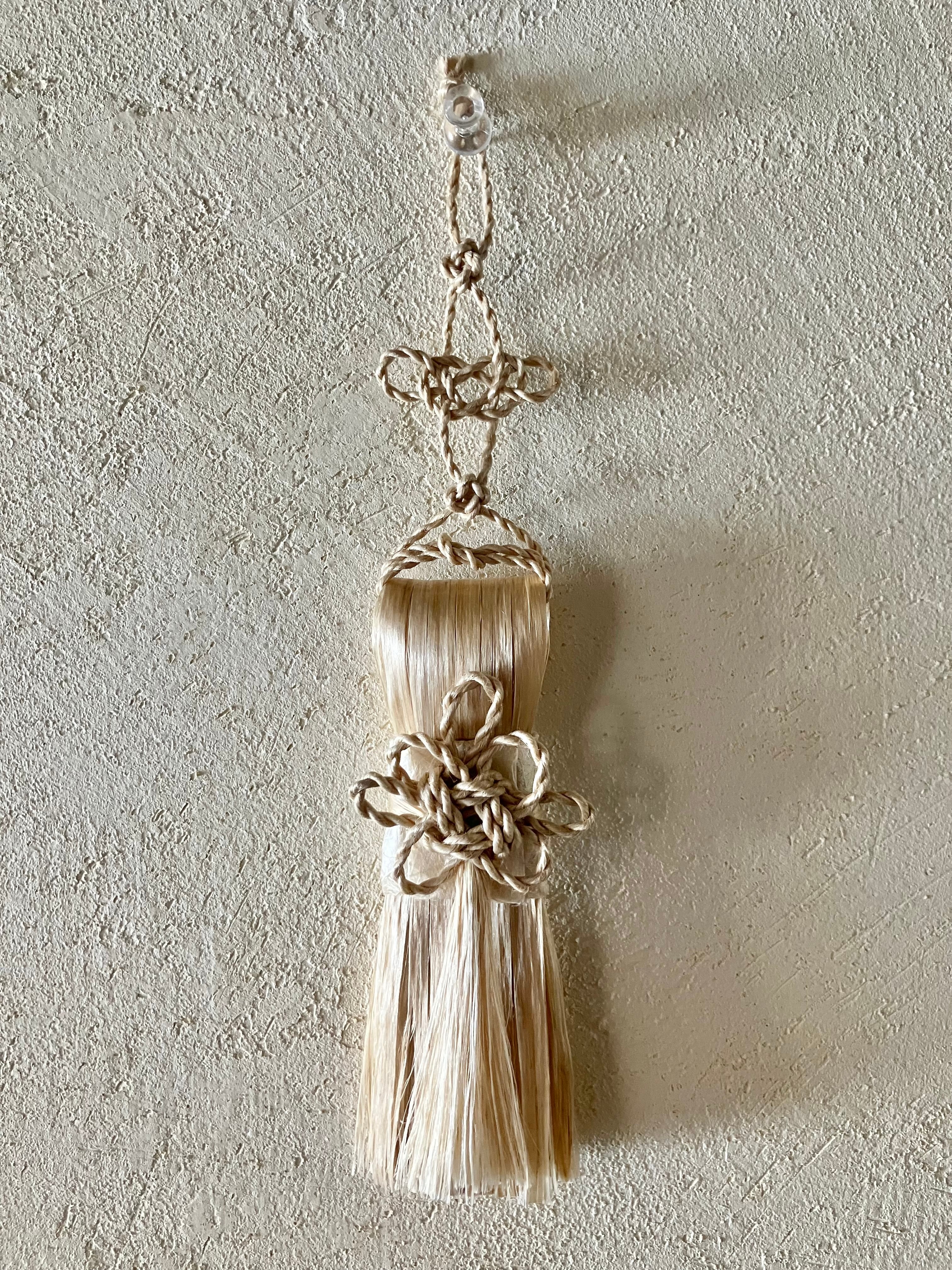 日本燦々により、整えられた精麻を使用しております。 リビング、寝室、玄関、台所、 施術室、セラピールーム、 カフェ、人の集まる場所など、 お好きな所へお飾りください。 全長: 21.5 cm 本体長さ: 11.5 cm 菊結びの横幅 : 4.5 cm