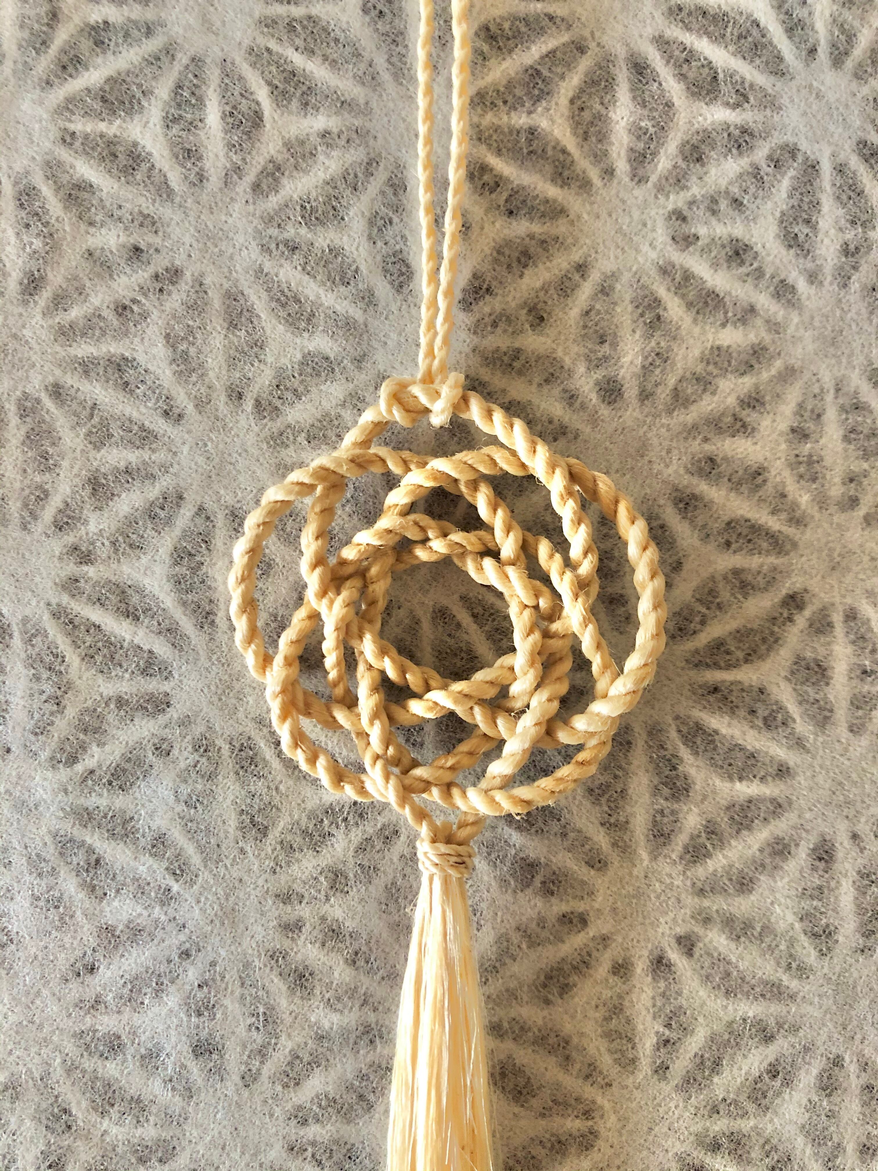 精麻から紐を結び、それを六方緒じめ結びの小さなストラップにしました。